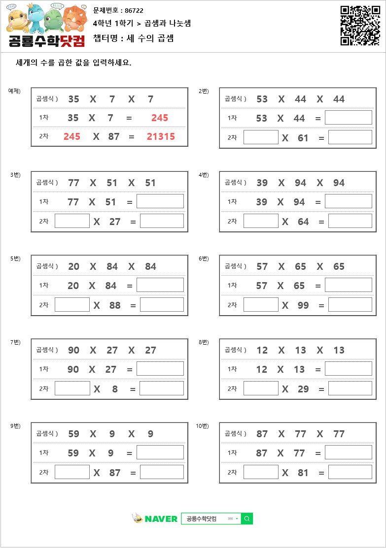 본 문제지는 공룡수학닷컴에서 제공하는 초등학교 무료 수학 연산문제 프린트 학습지 입니다. 문제지의 정답을 확인하시려면 우측 상단의 QR코드를 핸드폰 카메라로 비추거나, 공룡수학닷컴에서 문제번호를 입력하세요. 공룡수학닷컴은 학습문제를 프린트하여 풀수도 있고, 사이트에서 문제의 답을 입력하는 온라인 학습의 기능도 제공하고 있습니다. 공룡수학의 무료회원이 되시면, 아이들의 학습 스케줄을 지정하여 아이들이 매일매일 스스로 학습하며, 아이들의 문제풀이 결과를 언제든 확인할수 있습니다. 공룡수학에 방문하시려면 네이버에서 '공룡수학닷컴'을 검색하시거나 http://dino-math.co.kr 로 방문해 주세요.