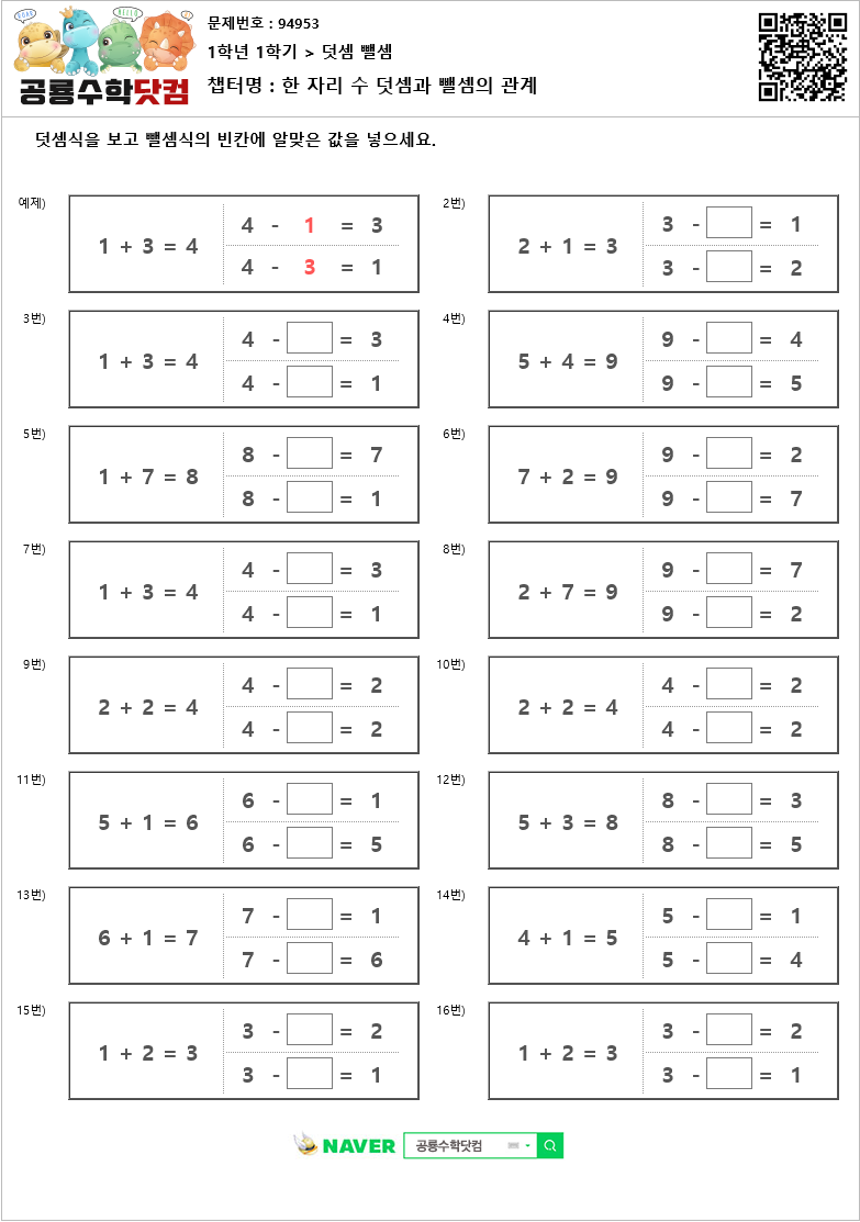본 문제지는 공룡수학닷컴에서 제공하는 초등학교 무료 수학 연산문제 프린트 학습지 입니다. 문제지의 정답을 확인하시려면 우측 상단의 QR코드를 핸드폰 카메라로 비추거나, 공룡수학닷컴에서 문제번호를 입력하세요. 공룡수학닷컴은 학습문제를 프린트하여 풀수도 있고, 사이트에서 문제의 답을 입력하는 온라인 학습의 기능도 제공하고 있습니다. 공룡수학의 무료회원이 되시면, 아이들의 학습 스케줄을 지정하여 아이들이 매일매일 스스로 학습하며, 아이들의 문제풀이 결과를 언제든 확인할수 있습니다. 공룡수학에 방문하시려면 네이버에서 '공룡수학닷컴'을 검색하시거나 http://dino-math.co.kr 로 방문해 주세요.