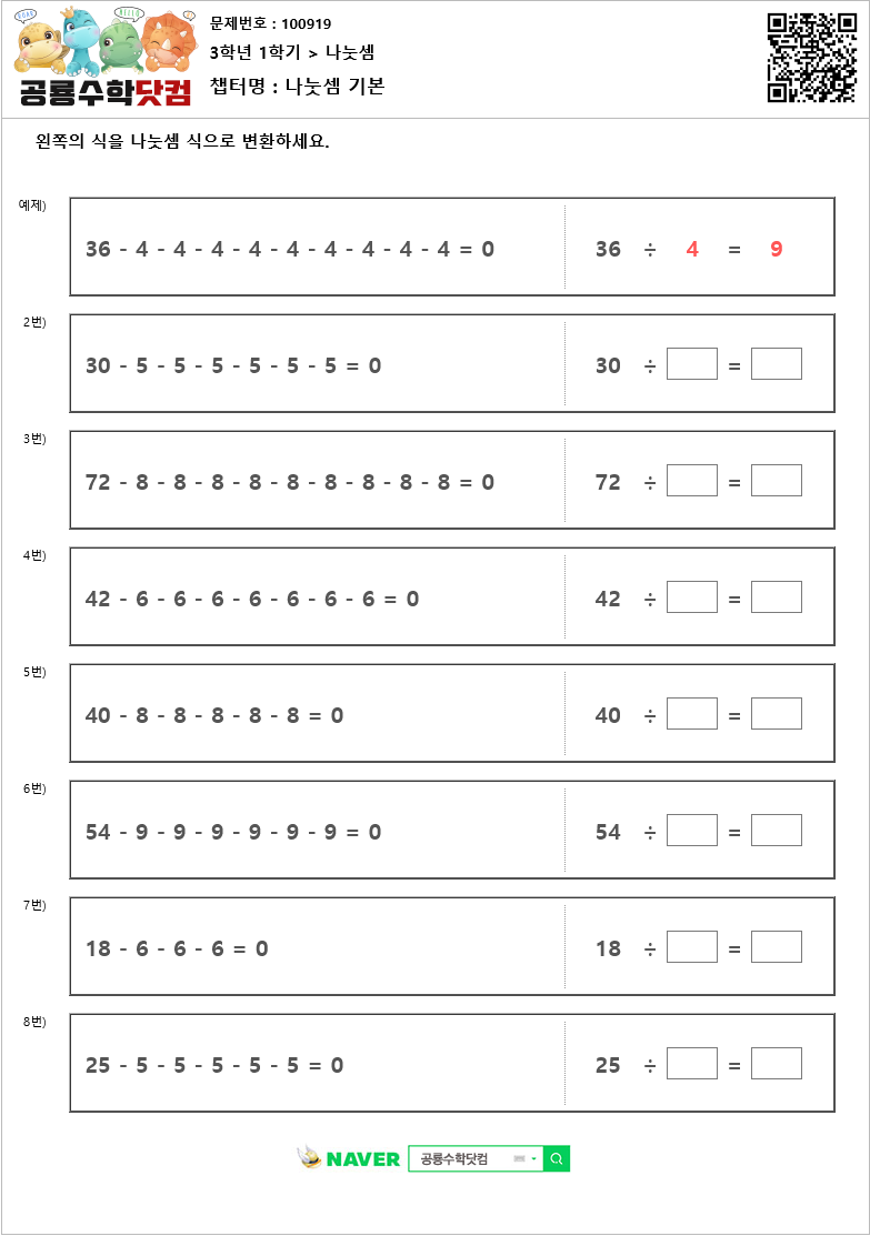 본 문제지는 공룡수학닷컴에서 제공하는 초등학교 무료 수학 연산문제 프린트 학습지 입니다. 문제지의 정답을 확인하시려면 우측 상단의 QR코드를 핸드폰 카메라로 비추거나, 공룡수학닷컴에서 문제번호를 입력하세요. 공룡수학닷컴은 학습문제를 프린트하여 풀수도 있고, 사이트에서 문제의 답을 입력하는 온라인 학습의 기능도 제공하고 있습니다. 공룡수학의 무료회원이 되시면, 아이들의 학습 스케줄을 지정하여 아이들이 매일매일 스스로 학습하며, 아이들의 문제풀이 결과를 언제든 확인할수 있습니다. 공룡수학에 방문하시려면 네이버에서 '공룡수학닷컴'을 검색하시거나 http://dino-math.co.kr 로 방문해 주세요.