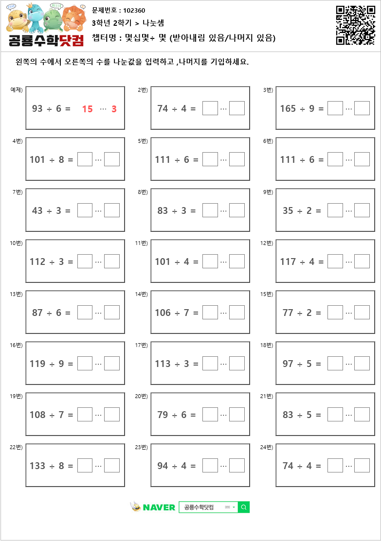 본 문제지는 공룡수학닷컴에서 제공하는 초등학교 무료 수학 연산문제 프린트 학습지 입니다. 문제지의 정답을 확인하시려면 우측 상단의 QR코드를 핸드폰 카메라로 비추거나, 공룡수학닷컴에서 문제번호를 입력하세요. 공룡수학닷컴은 학습문제를 프린트하여 풀수도 있고, 사이트에서 문제의 답을 입력하는 온라인 학습의 기능도 제공하고 있습니다. 공룡수학의 무료회원이 되시면, 아이들의 학습 스케줄을 지정하여 아이들이 매일매일 스스로 학습하며, 아이들의 문제풀이 결과를 언제든 확인할수 있습니다. 공룡수학에 방문하시려면 네이버에서 '공룡수학닷컴'을 검색하시거나 http://dino-math.co.kr 로 방문해 주세요.