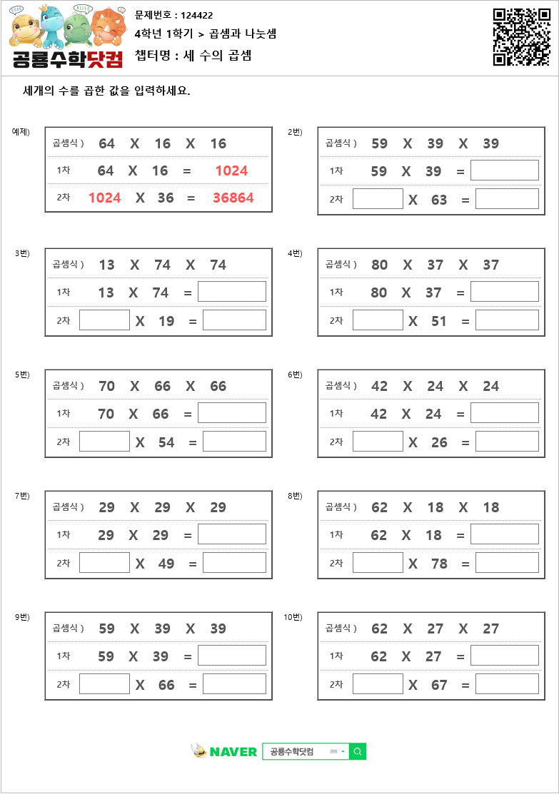 본 문제지는 공룡수학닷컴에서 제공하는 초등학교 무료 수학 연산문제 프린트 학습지 입니다.
