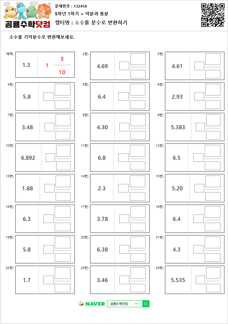 본 문제지는 공룡수학닷컴에서 제공하는 초등학교 무료 수학 연산문제 프린트 학습지 입니다.