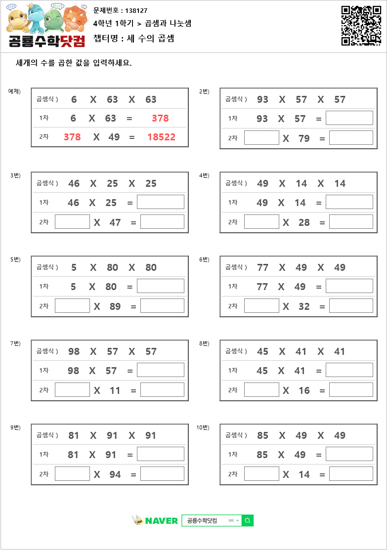 본 문제지는 공룡수학닷컴에서 제공하는 초등학교 무료 수학 연산문제 프린트 학습지 입니다.