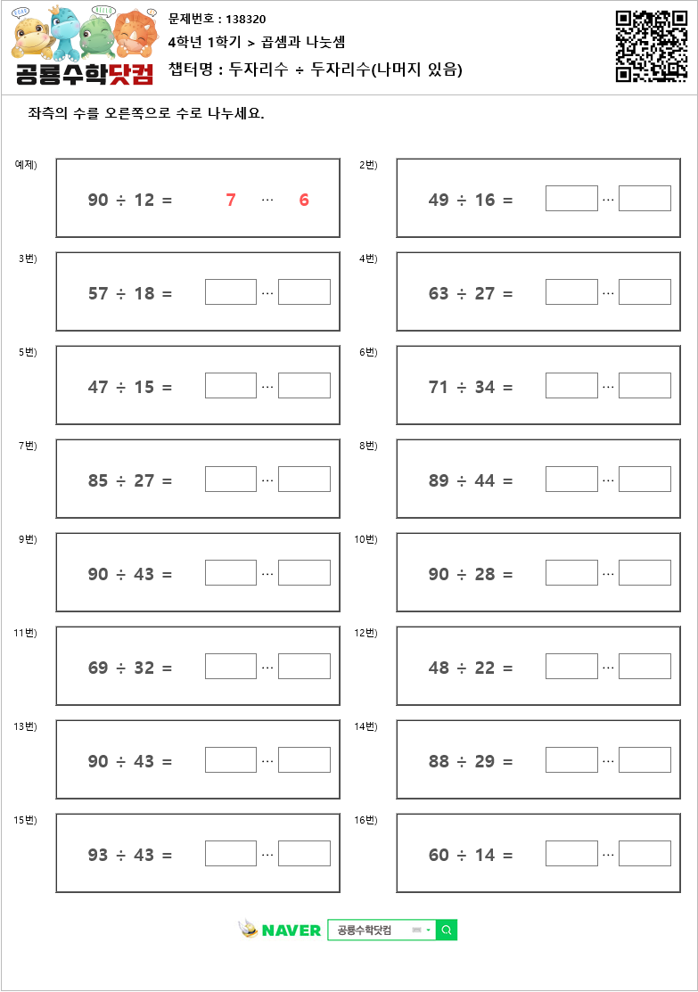 본 문제지는 공룡수학닷컴에서 제공하는 초등학교 무료 수학 연산문제 프린트 학습지 입니다.