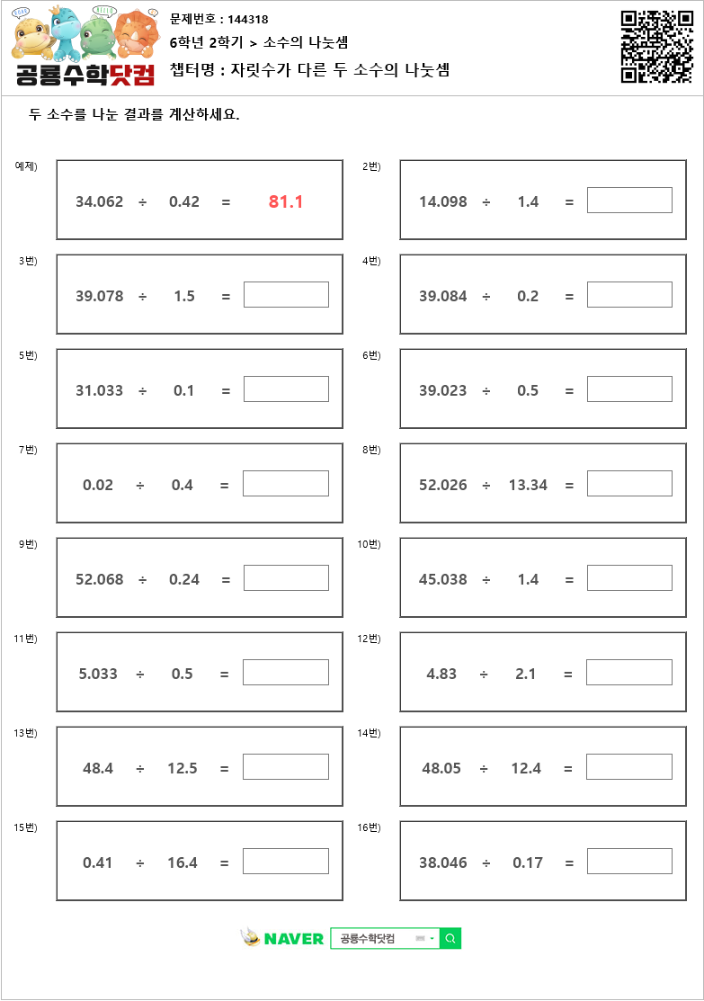 본 문제지는 공룡수학닷컴에서 제공하는 초등학교 무료 수학 연산문제 프린트 학습지 입니다.