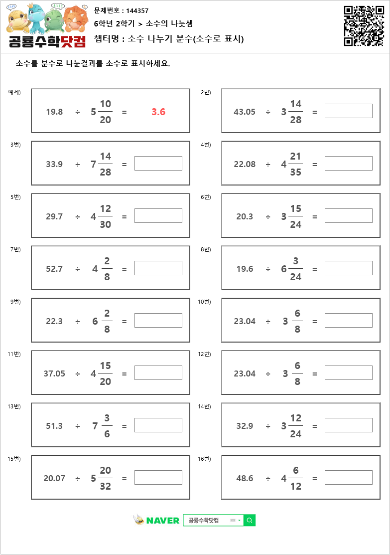 본 문제지는 공룡수학닷컴에서 제공하는 초등학교 무료 수학 연산문제 프린트 학습지 입니다.