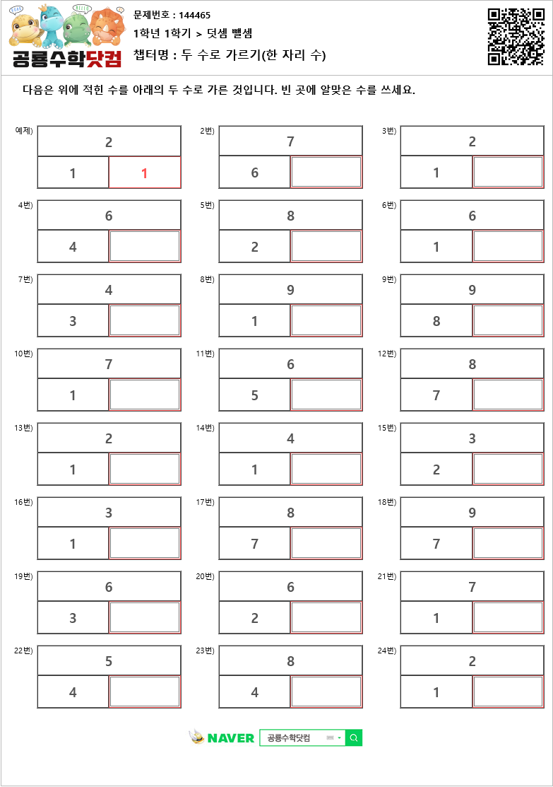문제설명 : 다음은 위에 적힌 수를 아래의 두 수로 가른 것입니다. 빈 곳에 알맞은 수를 쓰세요.