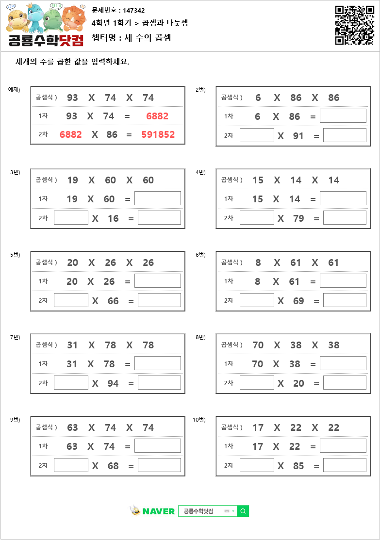 본 문제지는 공룡수학닷컴에서 제공하는 초등학교 무료 수학 연산문제 프린트 학습지 입니다.