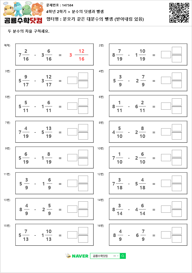 챕 터 명 : 분모가 같은 대분수의 뺄셈 (받아내림 있음)