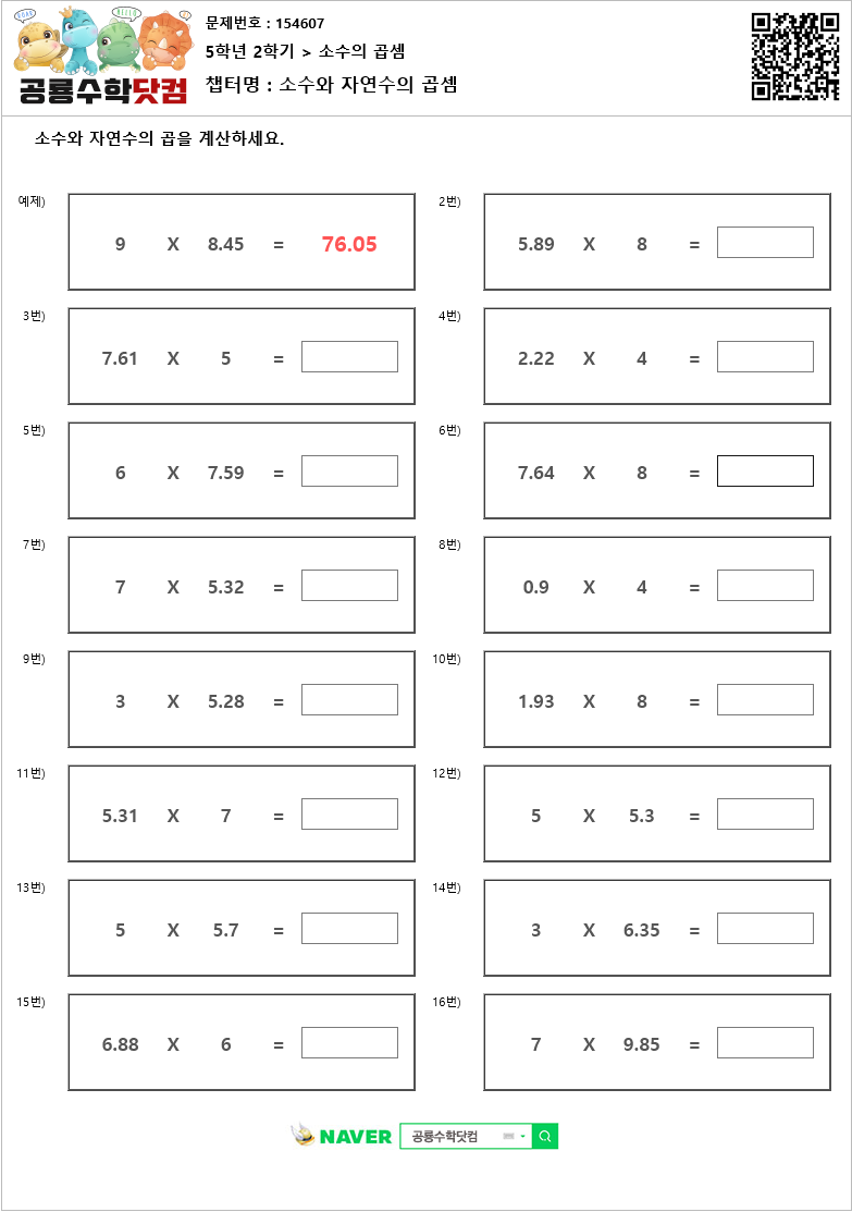 본 문제지는 공룡수학닷컴에서 제공하는 초등학교 무료 수학 연산문제 프린트 학습지 입니다.