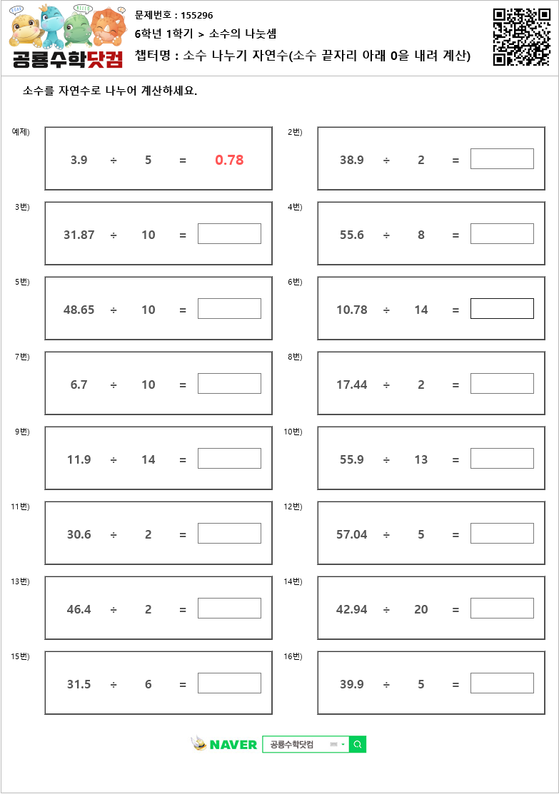 본 문제지는 공룡수학닷컴에서 제공하는 초등학교 무료 수학 연산문제 프린트 학습지 입니다.