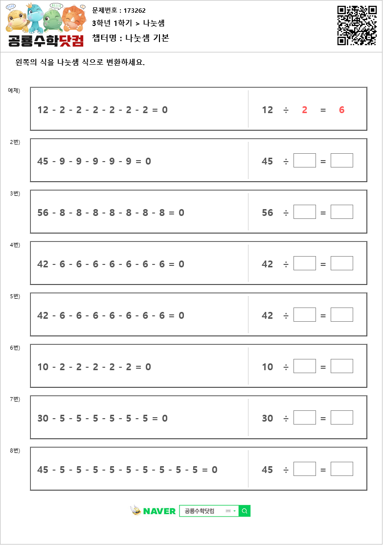 본 문제지는 공룡수학닷컴에서 제공하는 초등학교 무료 수학 연산문제 프린트 학습지 입니다.