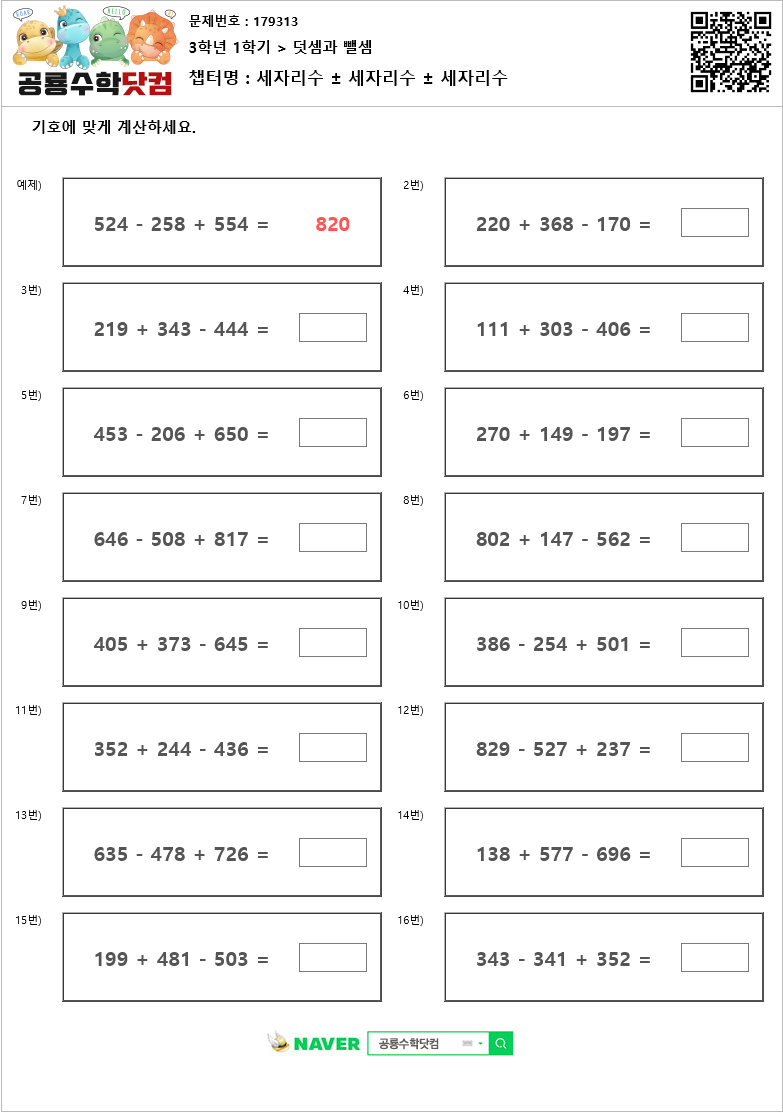 본 문제지는 공룡수학닷컴에서 제공하는 초등학교 무료 수학 연산문제 프린트 학습지 입니다. 문제지의 정답을 확인하시려면 우측 상단의 QR코드를 핸드폰 카메라로 비추거나, 공룡수학닷컴에서 문제번호를 입력하세요. 공룡수학닷컴은 학습문제를 프린트하여 풀수도 있고, 사이트에서 문제의 답을 입력하는 온라인 학습의 기능도 제공하고 있습니다. 공룡수학의 무료회원이 되시면, 아이들의 학습 스케줄을 지정하여 아이들이 매일매일 스스로 학습하며, 아이들의 문제풀이 결과를 언제든 확인할수 있습니다. 공룡수학에 방문하시려면 네이버에서 '공룡수학닷컴'을 검색하시거나 http://dino-math.co.kr 로 방문해 주세요.