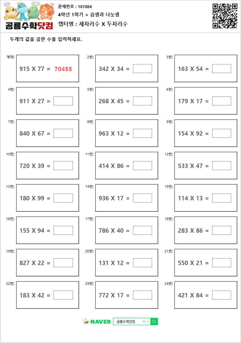 본 문제지는 공룡수학닷컴에서 제공하는 초등학교 무료 수학 연산문제 프린트 학습지 입니다. 문제지의 정답을 확인하시려면 우측 상단의 QR코드를 핸드폰 카메라로 비추거나, 공룡수학닷컴에서 문제번호를 입력하세요. 공룡수학닷컴은 학습문제를 프린트하여 풀수도 있고, 사이트에서 문제의 답을 입력하는 온라인 학습의 기능도 제공하고 있습니다. 공룡수학의 무료회원이 되시면, 아이들의 학습 스케줄을 지정하여 아이들이 매일매일 스스로 학습하며, 아이들의 문제풀이 결과를 언제든 확인할수 있습니다. 공룡수학에 방문하시려면 네이버에서 '공룡수학닷컴'을 검색하시거나 http://dino-math.co.kr 로 방문해 주세요.