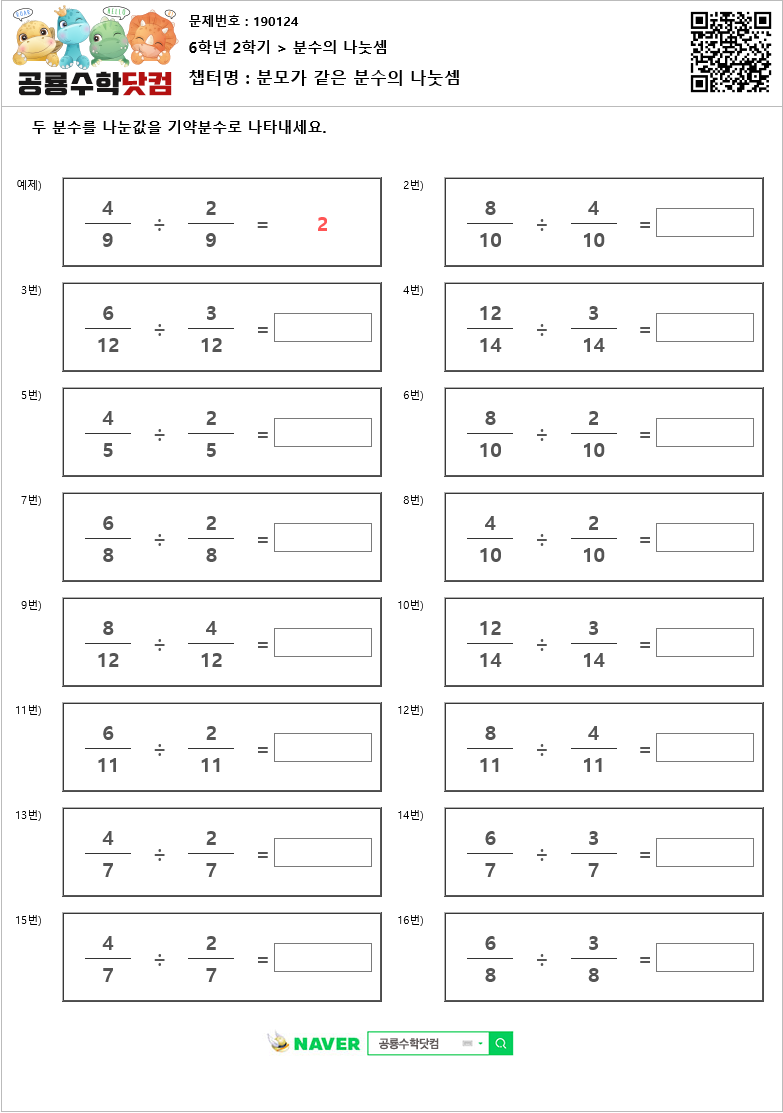 2022년 7월 15일 오늘의 수학 프린트 문제지는 분모가 같은 분수의 나눗셈 입니다.