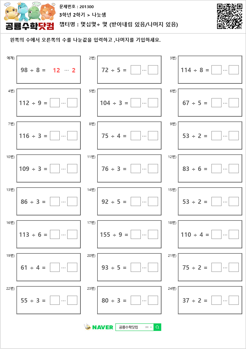 본 문제지는 공룡수학닷컴에서 제공하는 초등학교 무료 수학 연산문제 프린트 학습지 입니다.