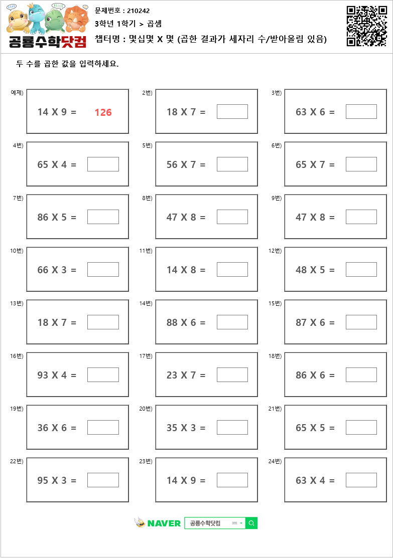 본 문제지는 공룡수학닷컴에서 제공하는 초등학교 무료 수학 연산문제 프린트 학습지 입니다.