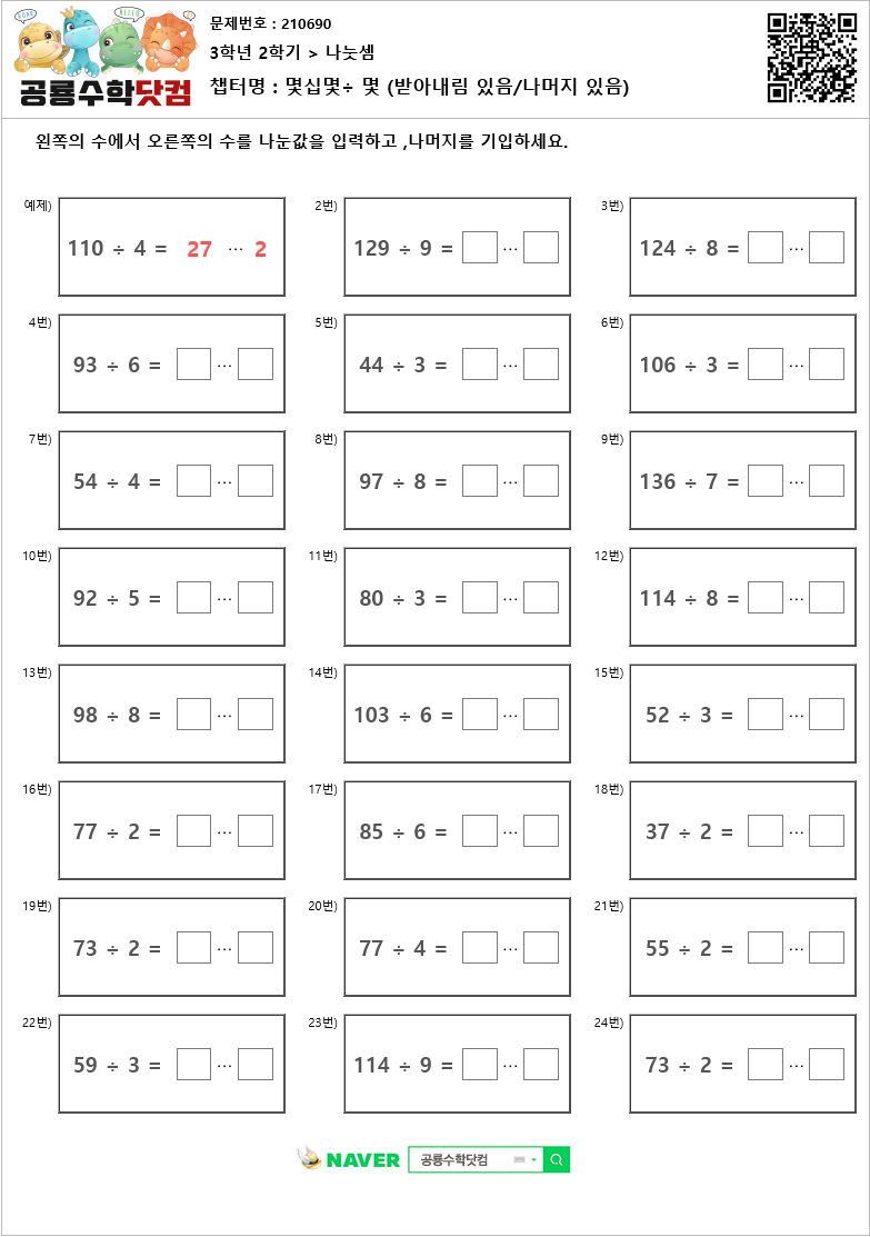 본 문제지는 공룡수학닷컴에서 제공하는 초등학교 무료 수학 연산문제 프린트 학습지 입니다.