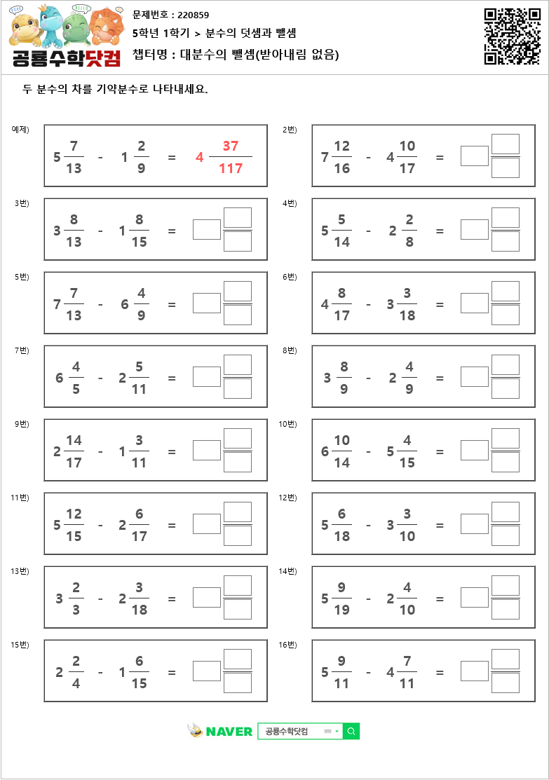 본 문제지는 공룡수학닷컴에서 제공하는 초등학교 무료 수학 연산문제 프린트 학습지 입니다. 문제지의 정답을 확인하시려면 우측 상단의 QR코드를 핸드폰 카메라로 비추거나, 공룡수학닷컴에서 문제번호를 입력하세요. 공룡수학닷컴은 학습문제를 프린트하여 풀수도 있고, 사이트에서 문제의 답을 입력하는 온라인 학습의 기능도 제공하고 있습니다. 공룡수학의 무료회원이 되시면, 아이들의 학습 스케줄을 지정하여 아이들이 매일매일 스스로 학습하며, 아이들의 문제풀이 결과를 언제든 확인할수 있습니다. 공룡수학에 방문하시려면 네이버에서 '공룡수학닷컴'을 검색하시거나 http://dino-math.co.kr 로 방문해 주세요.