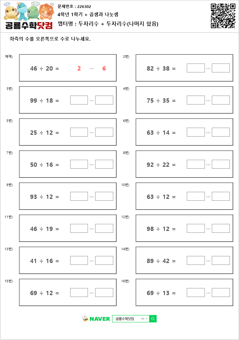 본 문제지는 공룡수학닷컴에서 제공하는 초등학교 무료 수학 연산문제 프린트 학습지 입니다. 문제지의 정답을 확인하시려면 우측 상단의 QR코드를 핸드폰 카메라로 비추거나, 공룡수학닷컴에서 문제번호를 입력하세요. 공룡수학닷컴은 학습문제를 프린트하여 풀수도 있고, 사이트에서 문제의 답을 입력하는 온라인 학습의 기능도 제공하고 있습니다. 공룡수학의 무료회원이 되시면, 아이들의 학습 스케줄을 지정하여 아이들이 매일매일 스스로 학습하며, 아이들의 문제풀이 결과를 언제든 확인할수 있습니다. 공룡수학에 방문하시려면 네이버에서 '공룡수학닷컴'을 검색하시거나 http://dino-math.co.kr 로 방문해 주세요.