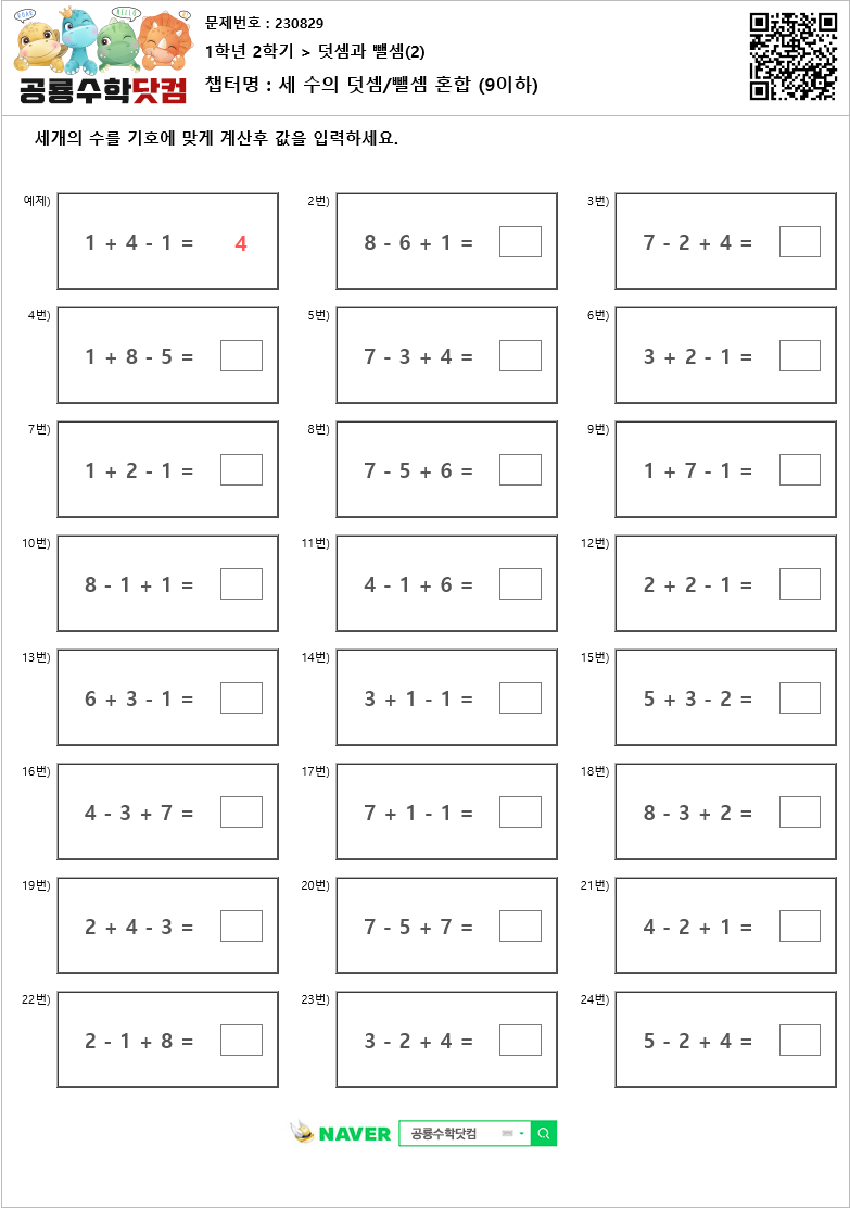 2022년 9월 20일 오늘의 수학 프린트 문제지는 세 수의 덧셈/뺄셈 혼합 (9이하) 입니다.