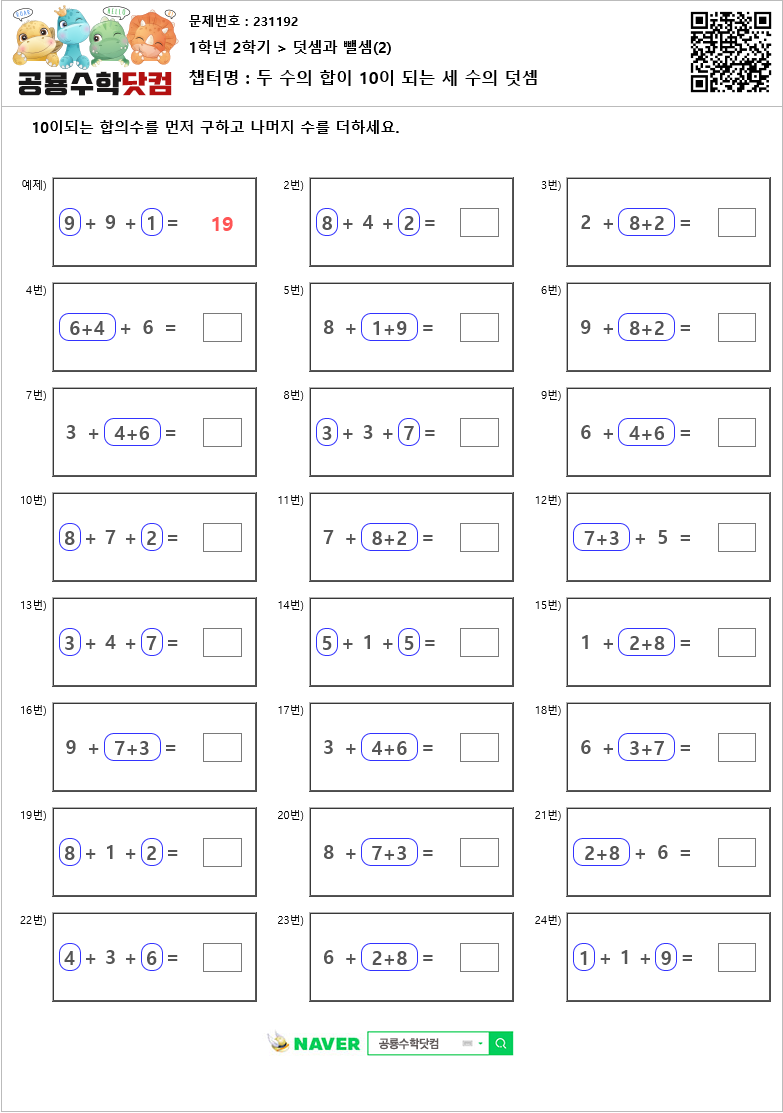 본 문제지는 공룡수학닷컴에서 제공하는 초등학교 무료 수학 연산문제 프린트 학습지 입니다. 문제지의 정답을 확인하시려면 우측 상단의 QR코드를 핸드폰 카메라로 비추거나, 공룡수학닷컴에서 문제번호를 입력하세요. 공룡수학닷컴은 학습문제를 프린트하여 풀수도 있고, 사이트에서 문제의 답을 입력하는 온라인 학습의 기능도 제공하고 있습니다. 공룡수학의 무료회원이 되시면, 아이들의 학습 스케줄을 지정하여 아이들이 매일매일 스스로 학습하며, 아이들의 문제풀이 결과를 언제든 확인할수 있습니다. 공룡수학에 방문하시려면 네이버에서 '공룡수학닷컴'을 검색하시거나 http://dino-math.co.kr 로 방문해 주세요.