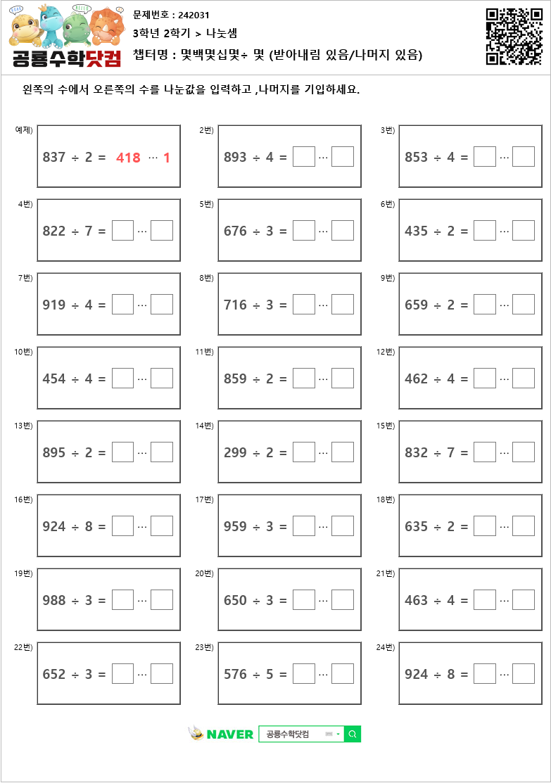 본 문제지는 공룡수학닷컴에서 제공하는 초등학교 무료 수학 연산문제 프린트 학습지 입니다. 문제지의 정답을 확인하시려면 우측 상단의 QR코드를 핸드폰 카메라로 비추거나, 공룡수학닷컴에서 문제번호를 입력하세요. 공룡수학닷컴은 학습문제를 프린트하여 풀수도 있고, 사이트에서 문제의 답을 입력하는 온라인 학습의 기능도 제공하고 있습니다. 공룡수학의 무료회원이 되시면, 아이들의 학습 스케줄을 지정하여 아이들이 매일매일 스스로 학습하며, 아이들의 문제풀이 결과를 언제든 확인할수 있습니다. 공룡수학에 방문하시려면 네이버에서 '공룡수학닷컴'을 검색하시거나 http://dino-math.co.kr 로 방문해 주세요.