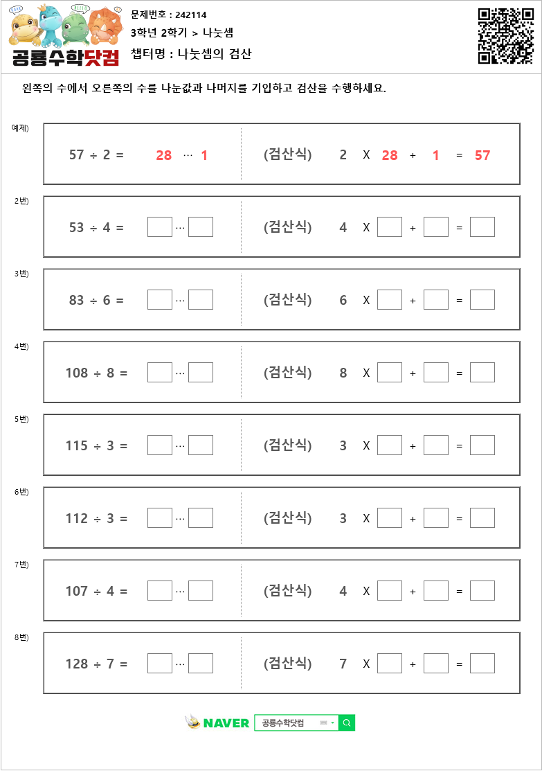 문제설명 : 왼쪽의 수에서 오른쪽의 수를 나눈값과 나머지를 기입하고 검산을 수행하세요.