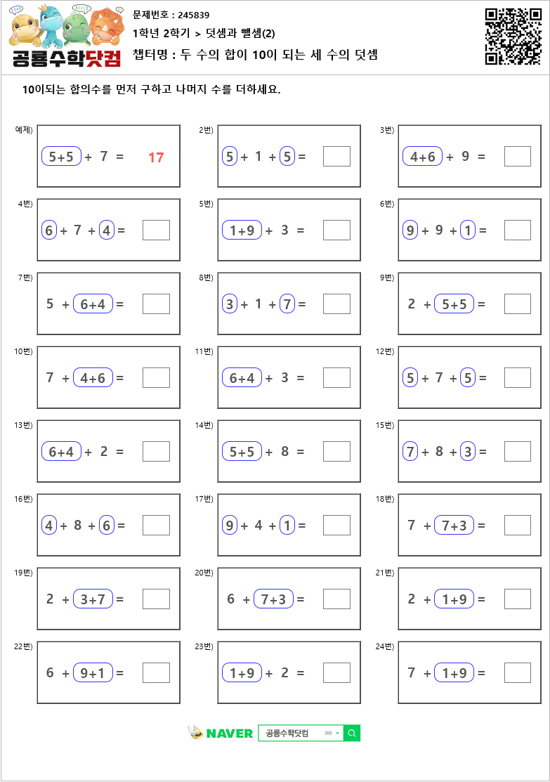 본 문제지는 공룡수학닷컴에서 제공하는 초등학교 무료 수학 연산문제 프린트 학습지 입니다. 문제지의 정답을 확인하시려면 우측 상단의 QR코드를 핸드폰 카메라로 비추거나, 공룡수학닷컴에서 문제번호를 입력하세요. 공룡수학닷컴은 학습문제를 프린트하여 풀수도 있고, 사이트에서 문제의 답을 입력하는 온라인 학습의 기능도 제공하고 있습니다. 공룡수학의 무료회원이 되시면, 아이들의 학습 스케줄을 지정하여 아이들이 매일매일 스스로 학습하며, 아이들의 문제풀이 결과를 언제든 확인할수 있습니다. 공룡수학에 방문하시려면 네이버에서 '공룡수학닷컴'을 검색하시거나 http://dino-math.co.kr 로 방문해 주세요.