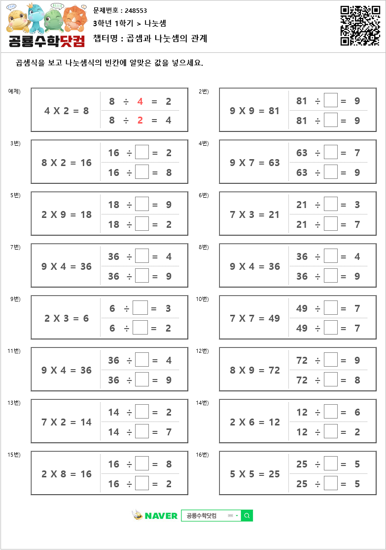 본 문제지는 공룡수학닷컴에서 제공하는 초등학교 무료 수학 연산문제 프린트 학습지 입니다. 문제지의 정답을 확인하시려면 우측 상단의 QR코드를 핸드폰 카메라로 비추거나, 공룡수학닷컴에서 문제번호를 입력하세요. 공룡수학닷컴은 학습문제를 프린트하여 풀수도 있고, 사이트에서 문제의 답을 입력하는 온라인 학습의 기능도 제공하고 있습니다. 공룡수학의 무료회원이 되시면, 아이들의 학습 스케줄을 지정하여 아이들이 매일매일 스스로 학습하며, 아이들의 문제풀이 결과를 언제든 확인할수 있습니다. 공룡수학에 방문하시려면 네이버에서 '공룡수학닷컴'을 검색하시거나 http://dino-math.co.kr 로 방문해 주세요.