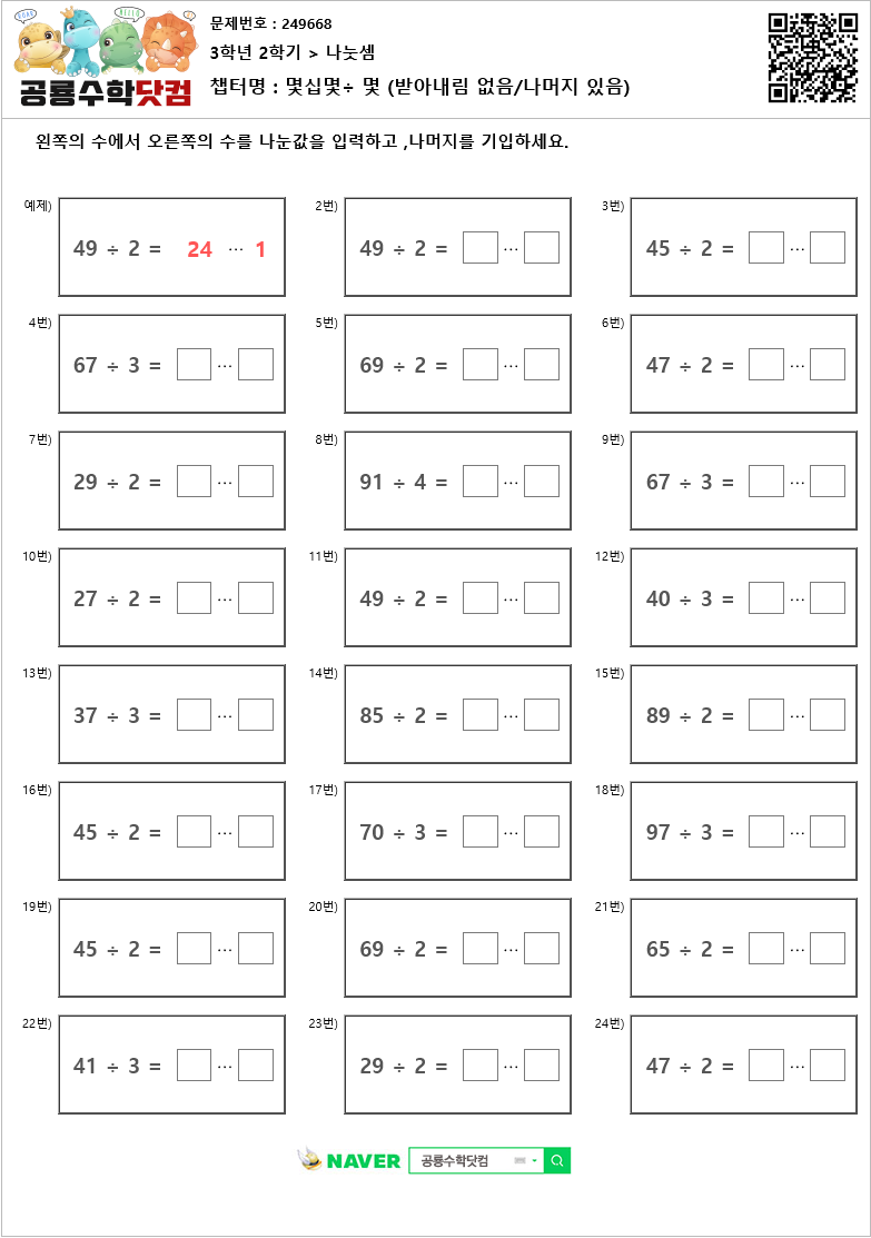 본 문제지는 공룡수학닷컴에서 제공하는 초등학교 무료 수학 연산문제 프린트 학습지 입니다. 문제지의 정답을 확인하시려면 우측 상단의 QR코드를 핸드폰 카메라로 비추거나, 공룡수학닷컴에서 문제번호를 입력하세요. 공룡수학닷컴은 학습문제를 프린트하여 풀수도 있고, 사이트에서 문제의 답을 입력하는 온라인 학습의 기능도 제공하고 있습니다. 공룡수학의 무료회원이 되시면, 아이들의 학습 스케줄을 지정하여 아이들이 매일매일 스스로 학습하며, 아이들의 문제풀이 결과를 언제든 확인할수 있습니다. 공룡수학에 방문하시려면 네이버에서 '공룡수학닷컴'을 검색하시거나 http://dino-math.co.kr 로 방문해 주세요.