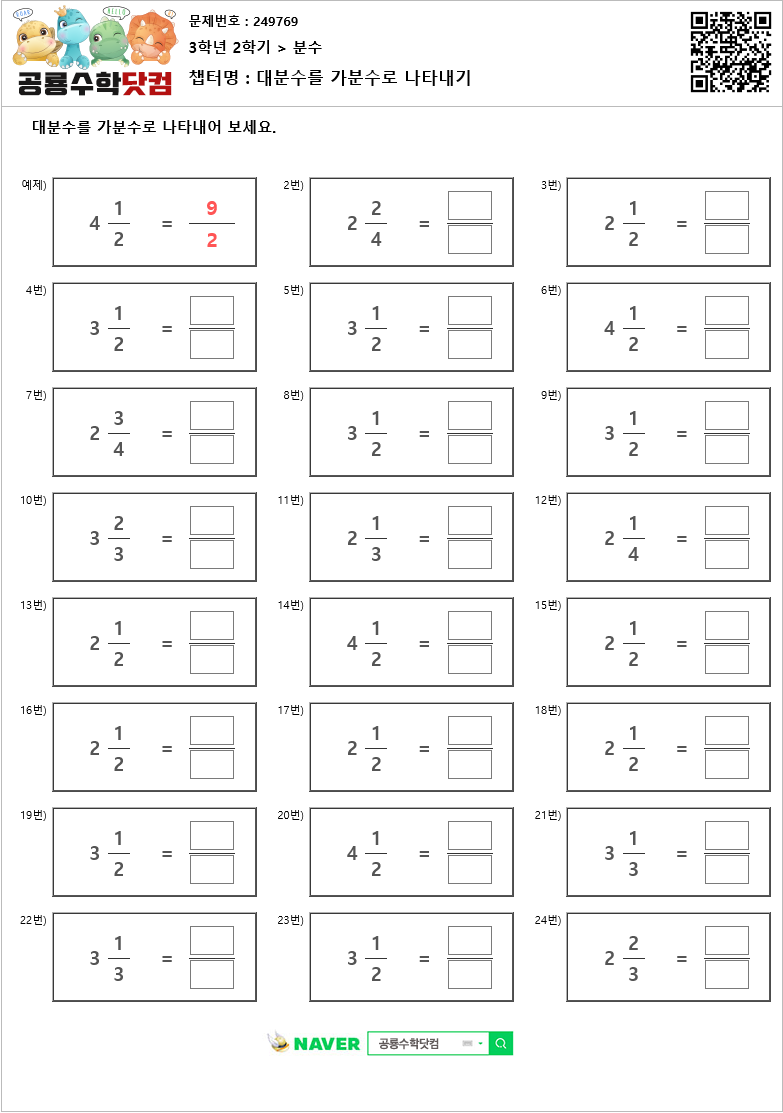본 문제지는 공룡수학닷컴에서 제공하는 초등학교 무료 수학 연산문제 프린트 학습지 입니다. 문제지의 정답을 확인하시려면 우측 상단의 QR코드를 핸드폰 카메라로 비추거나, 공룡수학닷컴에서 문제번호를 입력하세요. 공룡수학닷컴은 학습문제를 프린트하여 풀수도 있고, 사이트에서 문제의 답을 입력하는 온라인 학습의 기능도 제공하고 있습니다. 공룡수학의 무료회원이 되시면, 아이들의 학습 스케줄을 지정하여 아이들이 매일매일 스스로 학습하며, 아이들의 문제풀이 결과를 언제든 확인할수 있습니다. 공룡수학에 방문하시려면 네이버에서 '공룡수학닷컴'을 검색하시거나 http://dino-math.co.kr 로 방문해 주세요.