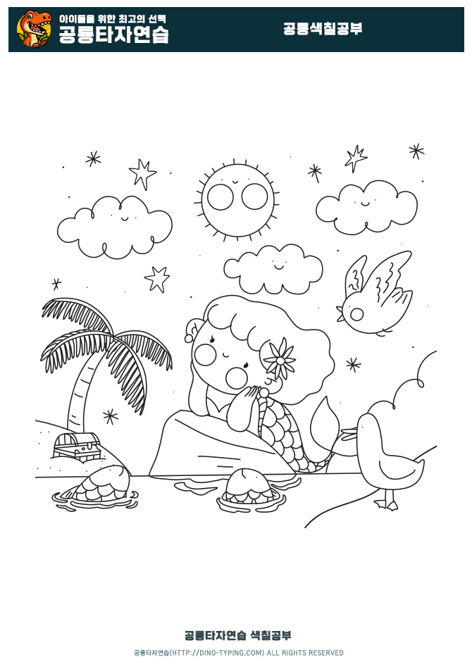 너무너무 어여쁜 인어공주가 바위에 나와서 쉬고 있어요 하늘에는 햇님도 떠있고 구름과 별도 있어요 예쁘게 색칠공부를 시작해봐요