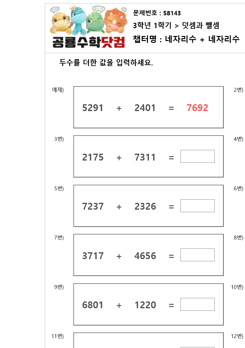 본 문제지는 공룡수학닷컴에서 제공하는 초등학교 무료 수학 연산문제 프린트 학습지 입니다. 문제지의 정답을 확인하시려면 우측 상단의 QR코드를 핸드폰 카메라로 비추거나, 공룡수학닷컴에서 문제번호를 입력하세요. 공룡수학닷컴은 학습문제를 프린트하여 풀수도 있고, 사이트에서 문제의 답을 입력하는 온라인 학습의 기능도 제공하고 있습니다. 공룡수학의 무료회원이 되시면, 아이들의 학습 스케줄을 지정하여 아이들이 매일매일 스스로 학습하며, 아이들의 문제풀이 결과를 언제든 확인할수 있습니다. 공룡수학에 방문하시려면 네이버에서 '공룡수학닷컴'을 검색하시거나 http://dino-math.co.kr 로 방문해 주세요.