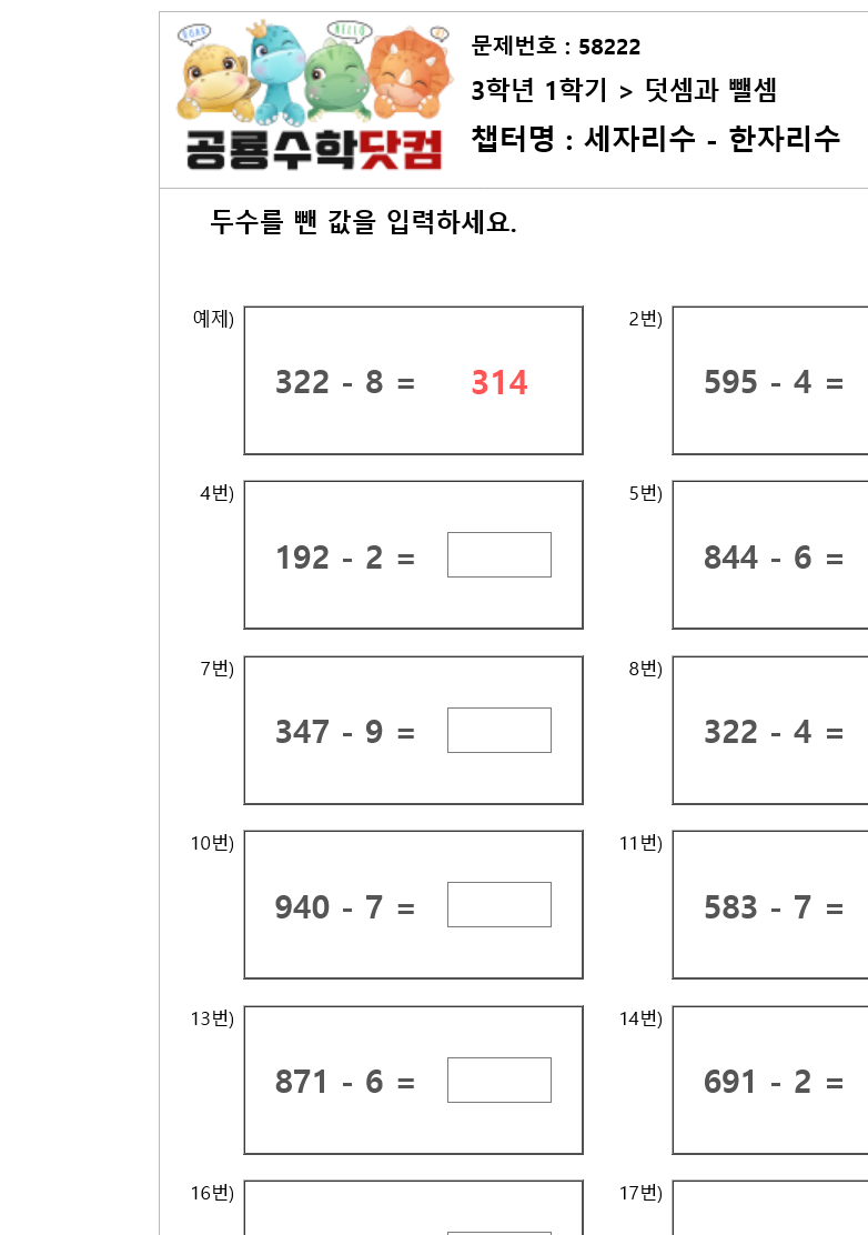 본 문제지는 공룡수학닷컴에서 제공하는 초등학교 무료 수학 연산문제 프린트 학습지 입니다.