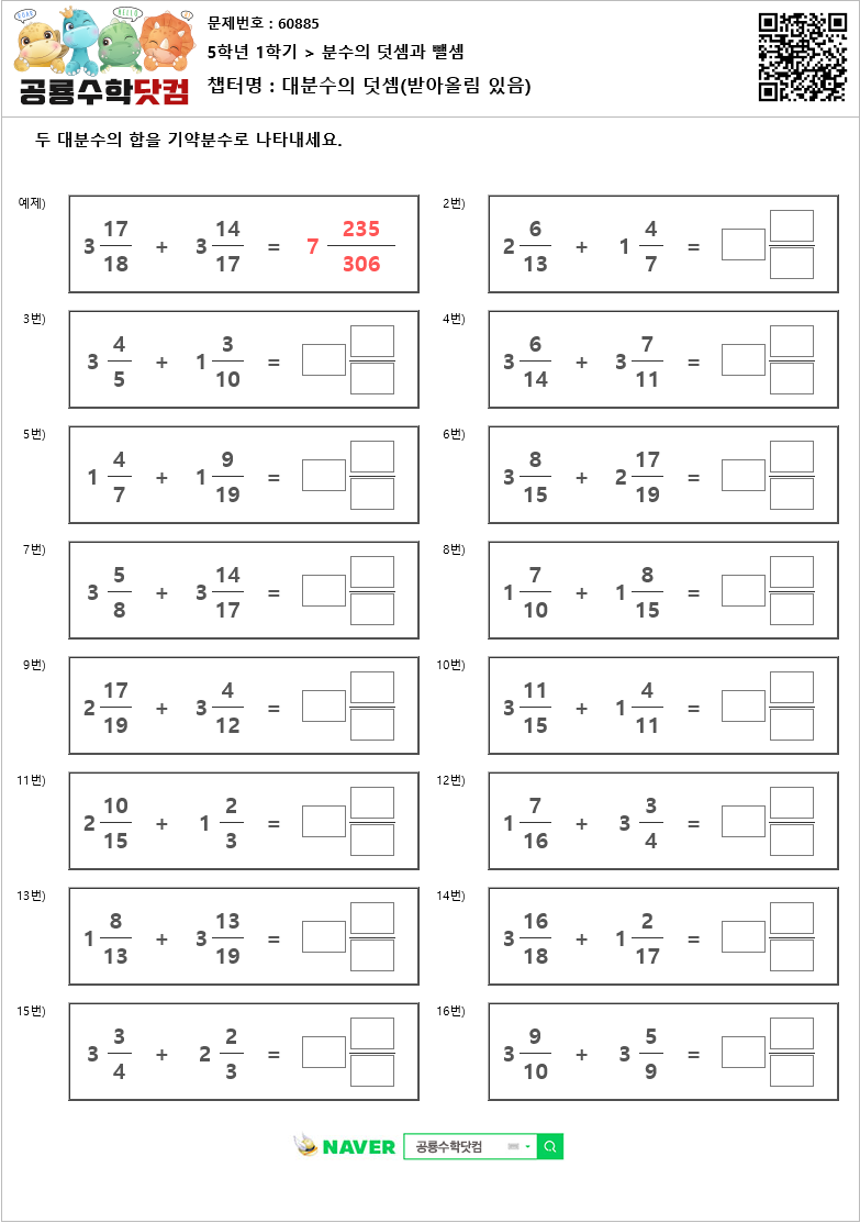 2022년 1월 4일 오늘의 수학 프린트 문제지는 대분수의 덧셈(받아올림 있음) 입니다.