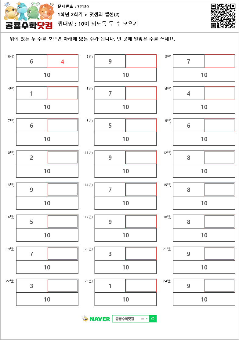 2022년 1월 19일 오늘의 수학 프린트 문제지는 10이 되도록 두 수 모으기 입니다.