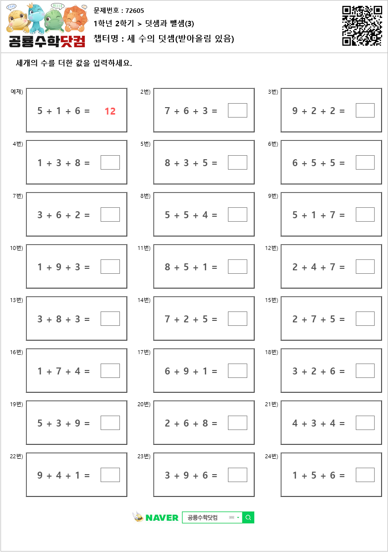 본 문제지는 공룡수학닷컴에서 제공하는 초등학교 무료 수학 연산문제 프린트 학습지 입니다. 문제지의 정답을 확인하시려면 우측 상단의 QR코드를 핸드폰 카메라로 비추거나, 공룡수학닷컴에서 문제번호를 입력하세요. 공룡수학닷컴은 학습문제를 프린트하여 풀수도 있고, 사이트에서 문제의 답을 입력하는 온라인 학습의 기능도 제공하고 있습니다. 공룡수학의 무료회원이 되시면, 아이들의 학습 스케줄을 지정하여 아이들이 매일매일 스스로 학습하며, 아이들의 문제풀이 결과를 언제든 확인할수 있습니다. 공룡수학에 방문하시려면 네이버에서 '공룡수학닷컴'을 검색하시거나 http://dino-math.co.kr 로 방문해 주세요.