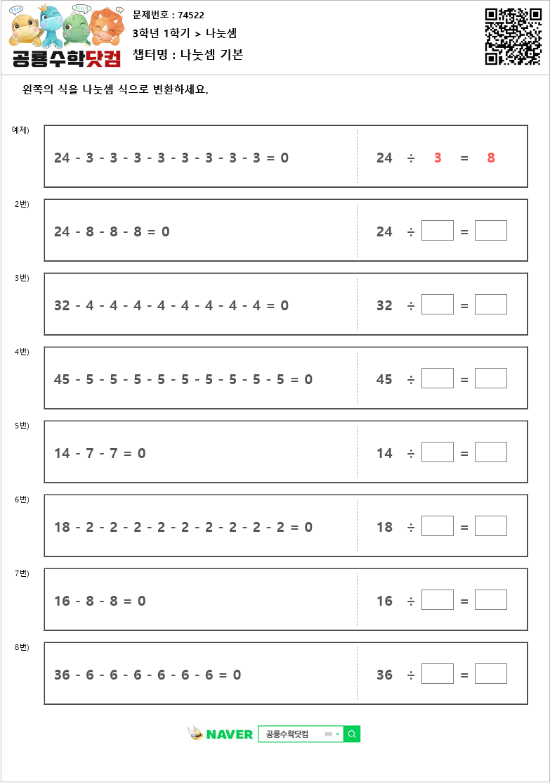 본 문제지는 공룡수학닷컴에서 제공하는 초등학교 무료 수학 연산문제 프린트 학습지 입니다. 문제지의 정답을 확인하시려면 우측 상단의 QR코드를 핸드폰 카메라로 비추거나, 공룡수학닷컴에서 문제번호를 입력하세요. 공룡수학닷컴은 학습문제를 프린트하여 풀수도 있고, 사이트에서 문제의 답을 입력하는 온라인 학습의 기능도 제공하고 있습니다. 공룡수학의 무료회원이 되시면, 아이들의 학습 스케줄을 지정하여 아이들이 매일매일 스스로 학습하며, 아이들의 문제풀이 결과를 언제든 확인할수 있습니다. 공룡수학에 방문하시려면 네이버에서 '공룡수학닷컴'을 검색하시거나 http://dino-math.co.kr 로 방문해 주세요.