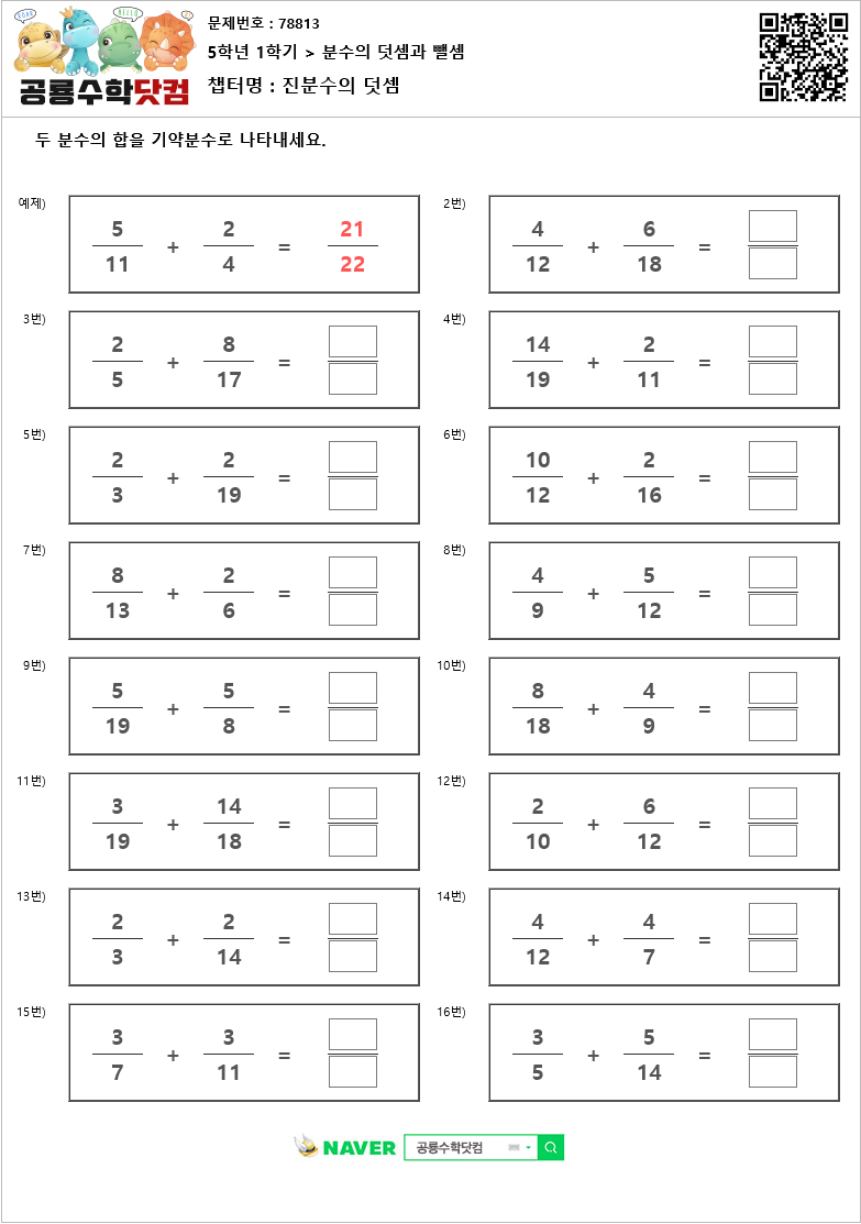 본 문제지는 공룡수학닷컴에서 제공하는 초등학교 무료 수학 연산문제 프린트 학습지 입니다. 문제지의 정답을 확인하시려면 우측 상단의 QR코드를 핸드폰 카메라로 비추거나, 공룡수학닷컴에서 문제번호를 입력하세요. 공룡수학닷컴은 학습문제를 프린트하여 풀수도 있고, 사이트에서 문제의 답을 입력하는 온라인 학습의 기능도 제공하고 있습니다. 공룡수학의 무료회원이 되시면, 아이들의 학습 스케줄을 지정하여 아이들이 매일매일 스스로 학습하며, 아이들의 문제풀이 결과를 언제든 확인할수 있습니다. 공룡수학에 방문하시려면 네이버에서 '공룡수학닷컴'을 검색하시거나 http://dino-math.co.kr 로 방문해 주세요.