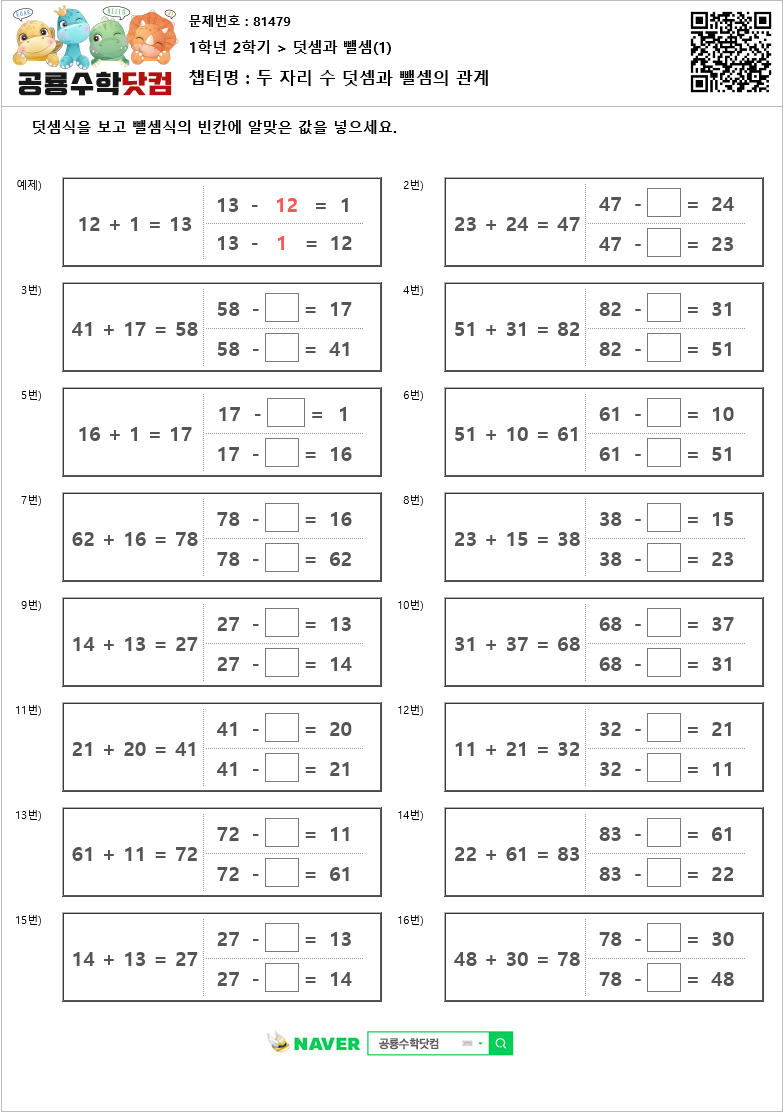 본 문제지는 공룡수학닷컴에서 제공하는 초등학교 무료 수학 연산문제 프린트 학습지 입니다. 문제지의 정답을 확인하시려면 우측 상단의 QR코드를 핸드폰 카메라로 비추거나, 공룡수학닷컴에서 문제번호를 입력하세요. 공룡수학닷컴은 학습문제를 프린트하여 풀수도 있고, 사이트에서 문제의 답을 입력하는 온라인 학습의 기능도 제공하고 있습니다. 공룡수학의 무료회원이 되시면, 아이들의 학습 스케줄을 지정하여 아이들이 매일매일 스스로 학습하며, 아이들의 문제풀이 결과를 언제든 확인할수 있습니다. 공룡수학에 방문하시려면 네이버에서 '공룡수학닷컴'을 검색하시거나 http://dino-math.co.kr 로 방문해 주세요.
